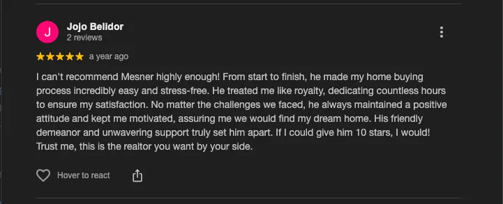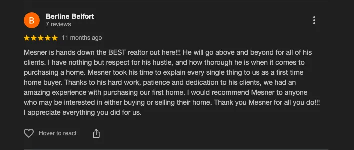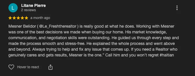 "The Best Realtor Ever! Working with Mr. Belidor was an amazing experience! He's professional, knowledgeable, and truly cares about his clients.